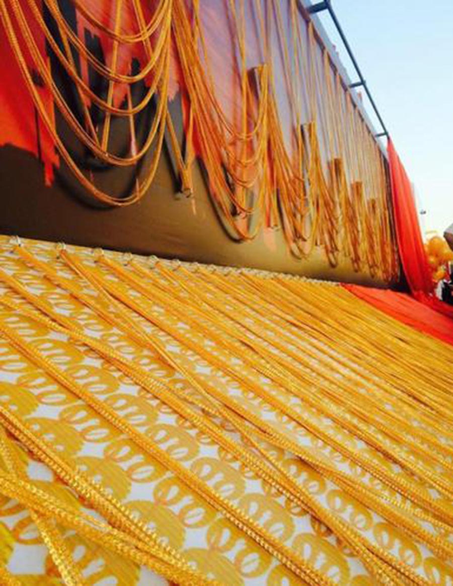 这家土豪公司动员70多名工人,连续工作40天,每天工作十多个小时,先打造出许多金链,然后再把这些链连结成一条5000米长的超大金链子。为了拉高身价,这家公司还特别为采购上门的消费者提供证书,证明买到的手链或项链,是从“全世界最长的金链子”切割下来的。
