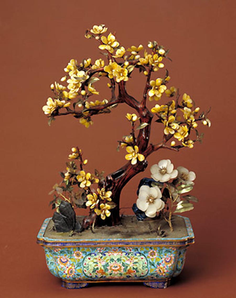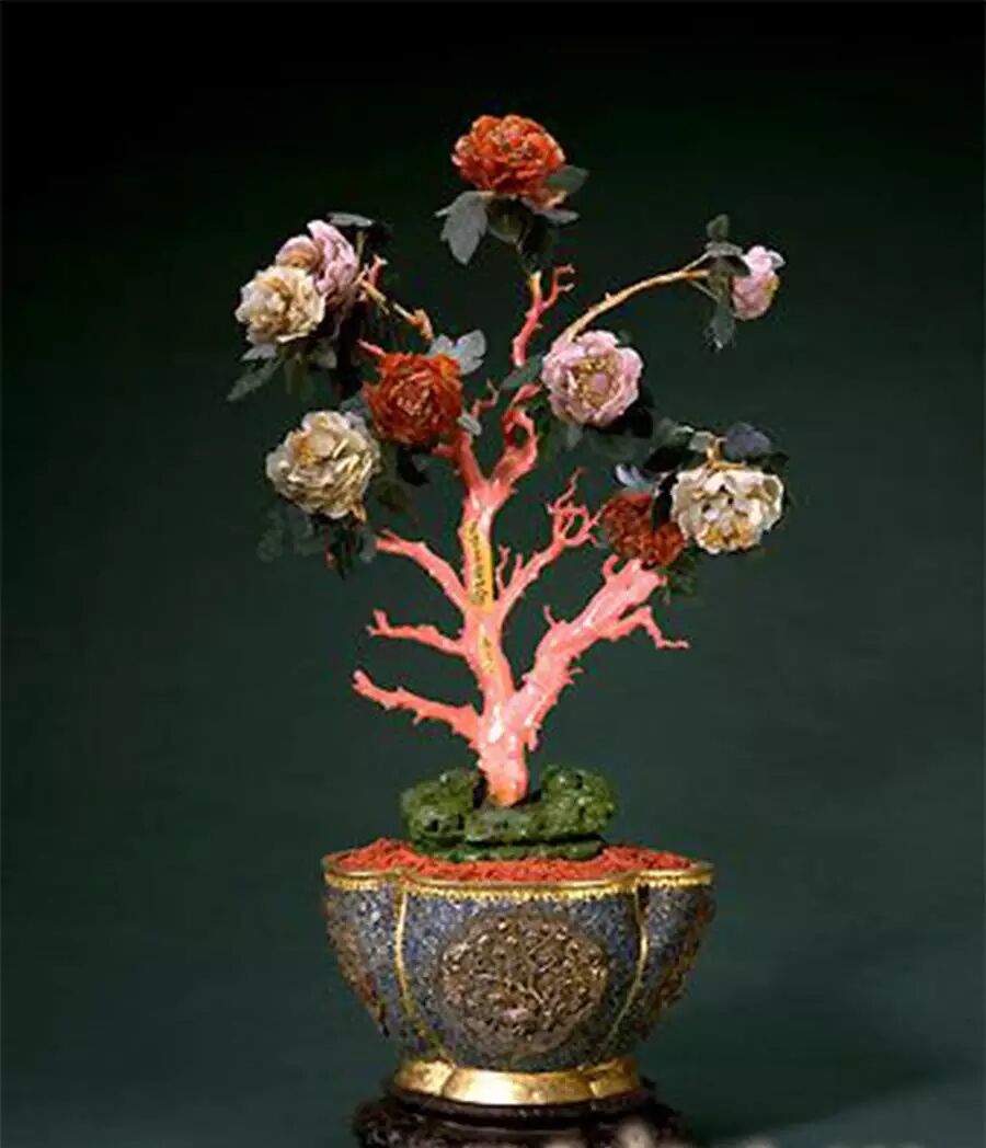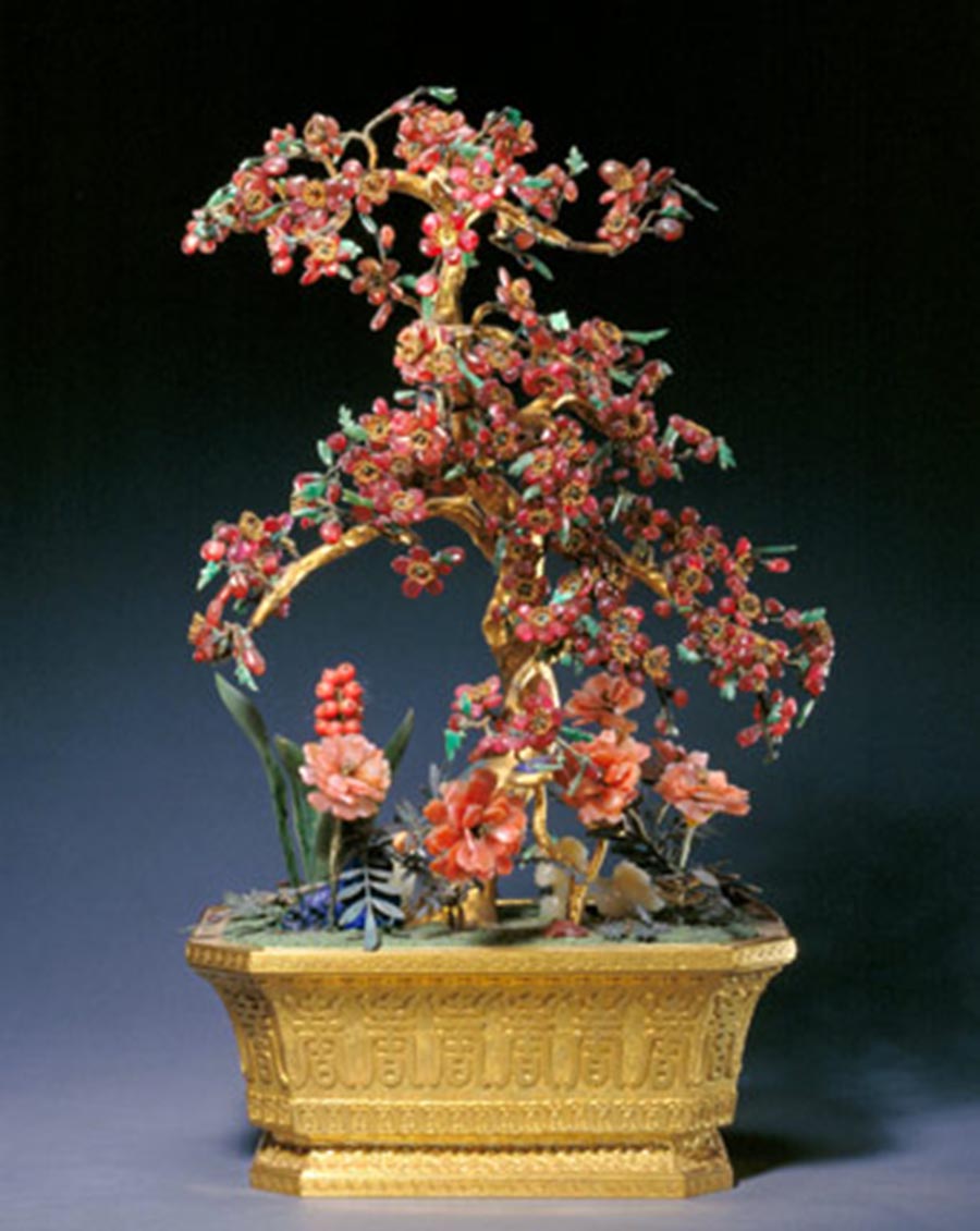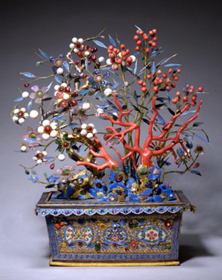 嵌珍珠宝石齐梅祝寿盆景,清中期,清宫旧藏。每个小如意头中又嵌红宝石,烧蓝花叶上又嵌以翡翠、碧玺、红宝石做的果实、花卉等图案,珊瑚珠和翡翠等宝石珠编串成各式花卉图案。盆上以珊瑚、天竹、梅花组成“齐眉祝寿”景致,银累丝点翠的山子上满嵌红、蓝、黄等各色宝石。此盆景镂金错玉,穿珠垒银,遍铺宝石,特别是一树梅花珠光宝气,共用大珍珠64颗,红蓝宝石216粒,精雕细作,鬼斧神工。