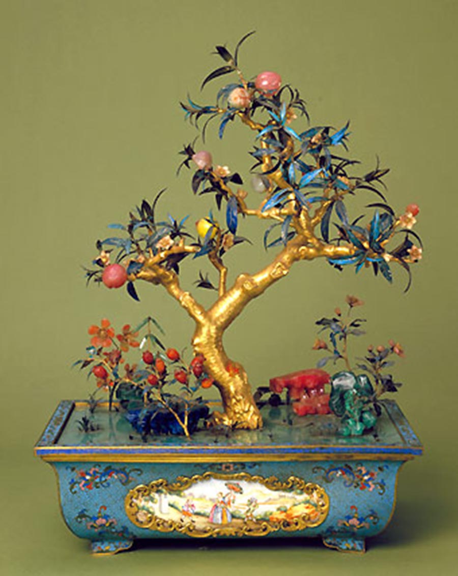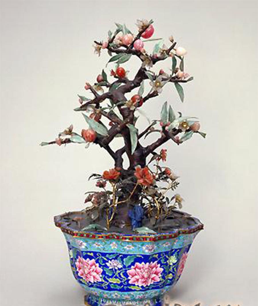 宝石九重春色图盆景,清乾隆,清宫旧藏。掐丝珐琅长方形盆,盆壁以湖蓝色釉铺地,四面中央为铜镀金錾花沿开光,内嵌彩绘西洋人物景致的画珐琅片,杜甫《奉和贾至舍人早朝大明宫》中有诗句:“午夜漏声催晓箭,九重春色醉仙桃。”此桃树盆景即寓诗中“九重春色”之意,表现春光明媚、欣欣向荣的太平景象,桃与寿石配景又含祝寿之意,此盆景为清乾隆年间不可多得的佳作。