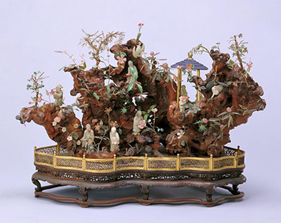 嵌玉石仙人祝寿图盆景,清中期,清宫旧藏。紫檀木垂云纹八足随形座,座边缘设铜镀金镂“万”字纹栏杆。座中设天然木山,古意盎然。山中以白玉、碧玉、玛瑙、翡翠、碧玺、松石等制作灵芝、仙桃、瑶草嘉蕙等,于孔隙石笋之间倒挂丛生,五色缤纷。7位仙翁或立于山腰,或相伴行于山间,或对坐亭间畅谈。玉鹤口衔仙草飞悬在山顶,仰望上方的灵草.此件寓意仙人祝寿的景观造型大方,人物刻划细腻,神态各异。