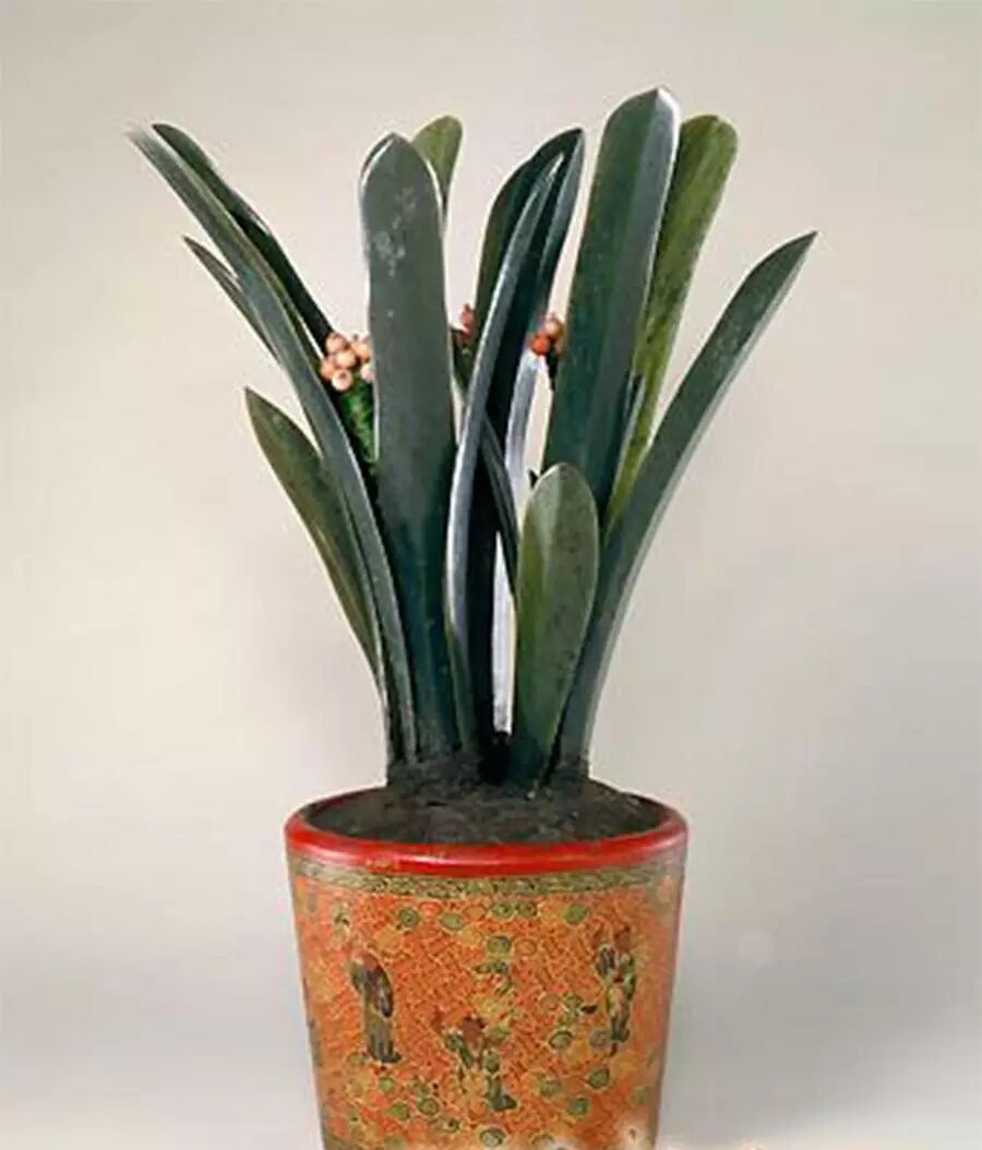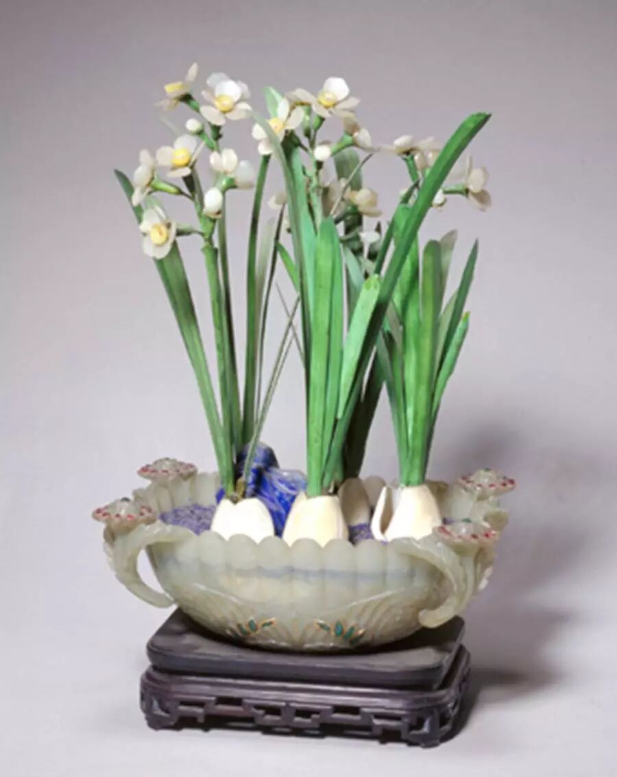 象牙嵌玉石水仙盆景,清中期,清宫旧藏。青玉菊瓣洗式盆,四角雕成双叶菊花形,菊花上嵌红宝石、绿料,盆中有青金石制湖石,雕象牙为根,白玉为花,黄玉为心。水仙主题的盆景取“芝仙祝寿”之意,宫廷庆帝后寿诞之时, 此盆景风格清雅,盆中景致牙叶挺拔,玉花明秀。