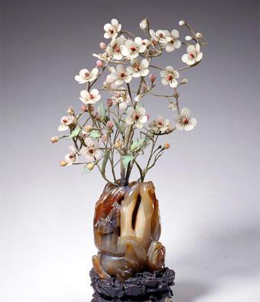 玛瑙雕佛手为盆,佛手一大一小二枚合抱,盆壁上又巧雕一蝴蝶飞落。盆下配镂雕木座。盆上用绿丝线包缠铜丝并弯作枝条状做成梅树,梅花之银鎏金花萼、花蕊焊接于铜枝顶端,又以铜丝裹以红丝线为花心雌蕊,以白玉和白色料做梅花之五瓣,镶粘于花萼与花蕊之间。含苞未开之蕾则在银萼上镶嵌白玉或芙蓉石,花叶以青玉雕成。梅花之间又点缀几朵牙雕菊花,因日久花瓣略有脱落,叶以染色象牙制成,并以金彩勾画叶脉。此景花枝扶疏,亭亭如盖,细而不弱,柔而蕴刚,色彩配搭明快清丽,一树白色梅花与玛瑙盆相得益彰,雅洁而不失妩媚之风韵。