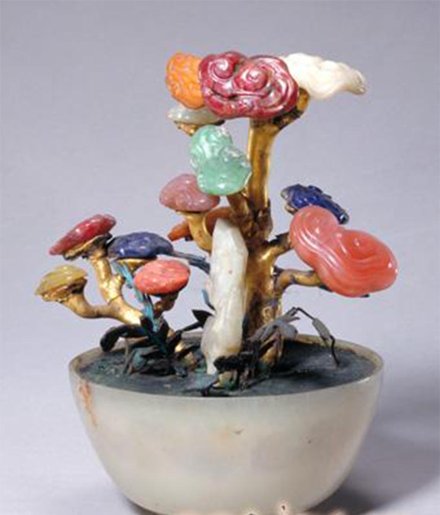 青玉碗作盆,上植灵芝、湖石、花叶等景致。灵芝树共2株,托上镶嵌各类宝石雕琢的灵芝头,包括白玉、黄玉、翡翠、玛瑙、碧玺、紫晶、蜜蜡、珊瑚、青金石等,下衬白玉雕琢的湖石、木制点翠花叶及木片灵芝剪影。