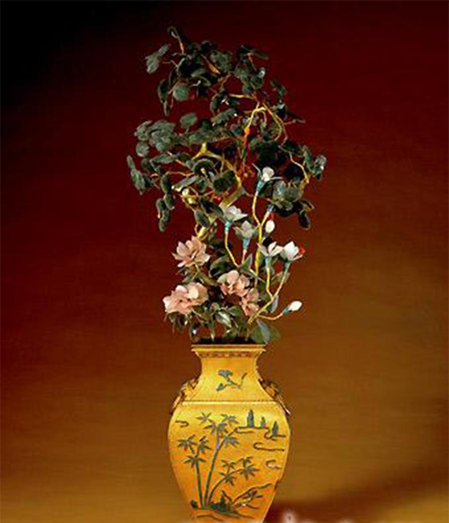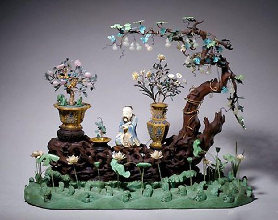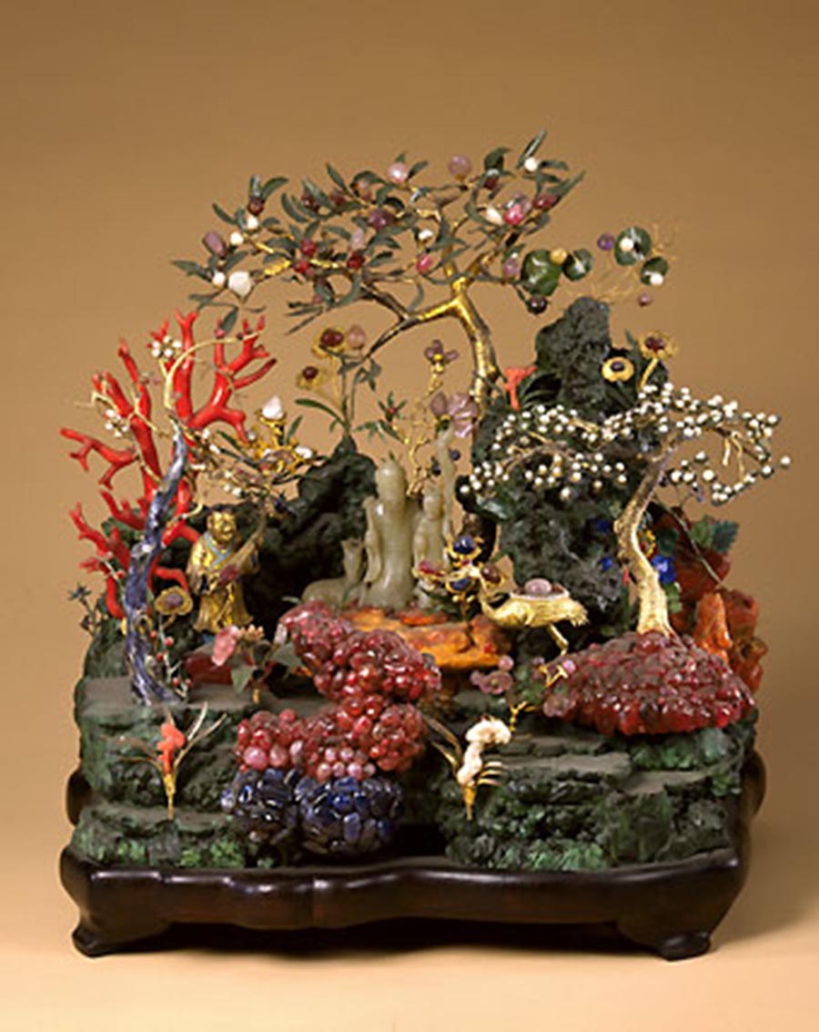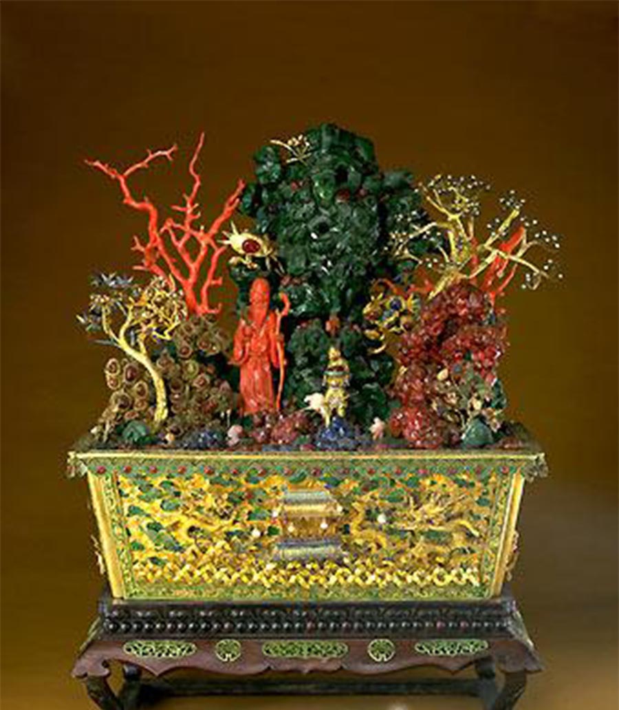 孔雀石嵌珠宝蓬莱仙境盆景,清乾隆,清宫旧藏。紫檀木座上,苍绿的孔雀石垒山垫底,孔雀石前以大小红、蓝宝石堆砌成湖石。孔雀石山前景平台上遍植金银宝石制作的灵花仙草,银镀金松树、珊瑚树和银镀金桃树,树上缀有珍珠花和碧玺桃果等。山间树下立白玉雕寿星、侍童及鹿,此件“蓬莱仙境”全部以黄金、共用珍珠280颗,红蓝宝石300多粒,碧玺和其它色彩石近100粒。其山石玲珑剔透,花树奇异多姿,尽显荣华富丽,是清代宫廷盆景中的珍品。
