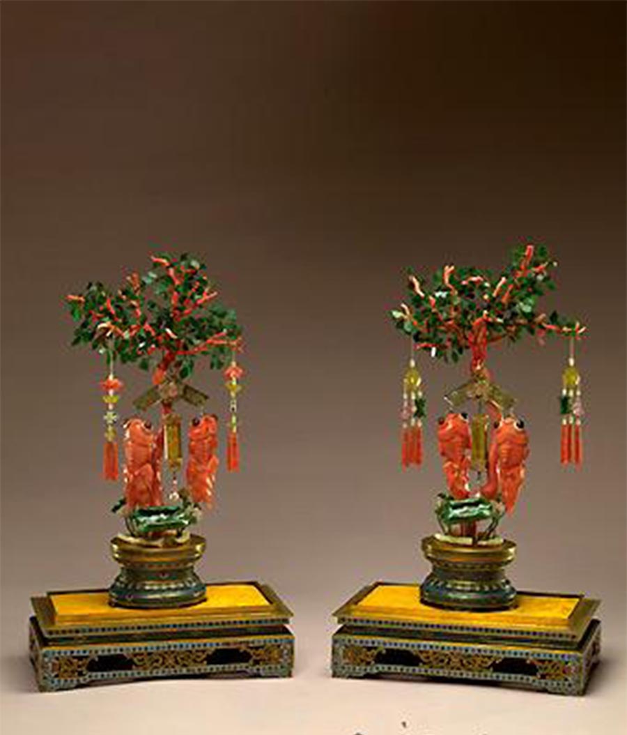掐丝珐琅圆形须弥座,座沿填蓝色回纹一周,束腰和近足处饰勾莲宝相花纹,束腰上下均饰仰覆莲瓣纹。座面正中植一珊瑚干翠叶树,红绿相映,明艳耀目。树下莲花数茎,缠绿丝荷茎托一大一小两片翡翠莲叶,叶中央各镶珍珠1粒,粉、黄色碧玺莲花5朵,翡翠莲藕2个,3个象牙莲藕平镶在镀金座面上。“吉庆有余”坠挂于枝干,挂坠上部为铜镀金嵌水晶磬,磬正中镶粉色碧玺蝙蝠,蝙蝠向下,口衔1块粉碧玺莲花牌,牌下连缀珍珠坠1个,磬的两端又挂嵌深红色蜜蜡眼的珊瑚大金鱼各一。树的两侧各以1支“福寿双全”挂坠辅衬,“福寿双全”坠上端为珊瑚金鱼,下连黄碧玺古钱,钱外缘有凸耳,耳下缀翡翠寿字、珍珠米珠盘肠和粉碧玺葫芦,最下端为珊瑚米珠穗,玲珑剔透。此景为宫中庆贺寿诞时陈设的吉祥摆件,用料丰富,精丽华美,既展示了皇家的富有,也表现出制作者独具的匠心和精湛的技巧,是清宫廷传世摆件中的精品。