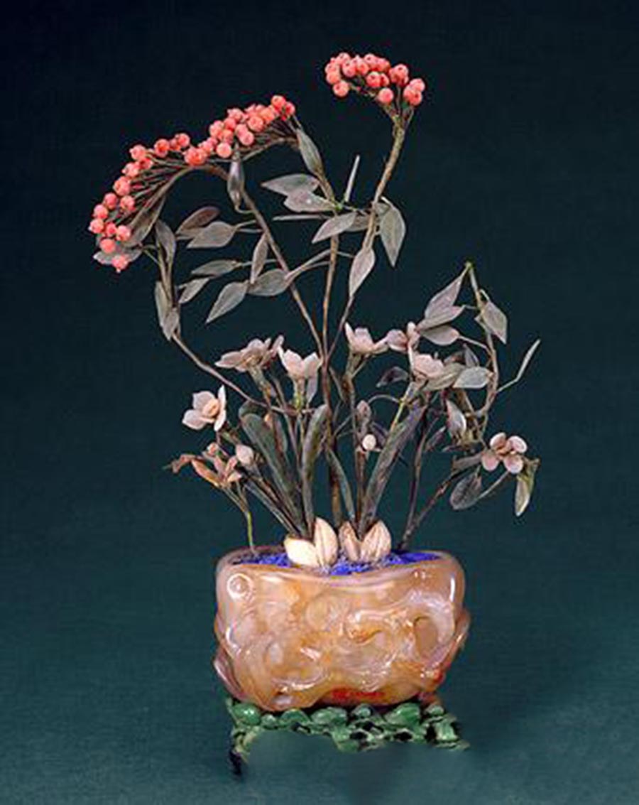 玛瑙雕桃实盆,其形状较抽象,盆壁浮雕桃树枝叶一周,盆下承以染牙桃纹座。盆内木托上置景,高者为天竺,稍低者为水仙。天竺顶端红果以珊瑚珠制,水仙则以白玉做花,青玉做叶。又植染牙石竹1株、料石桃花2株为此盆景层次鲜明,上部天竺较为疏朗,线条多变化,尤其顶冠红珊瑚果,富于动感,似因风而摇摆。下部水仙等花则较为繁密,构图更趋开张。下部风格淡雅,衬托出上部天竺的热烈。此为清宫日常陈设的小型盆景中工精质美之佳作。