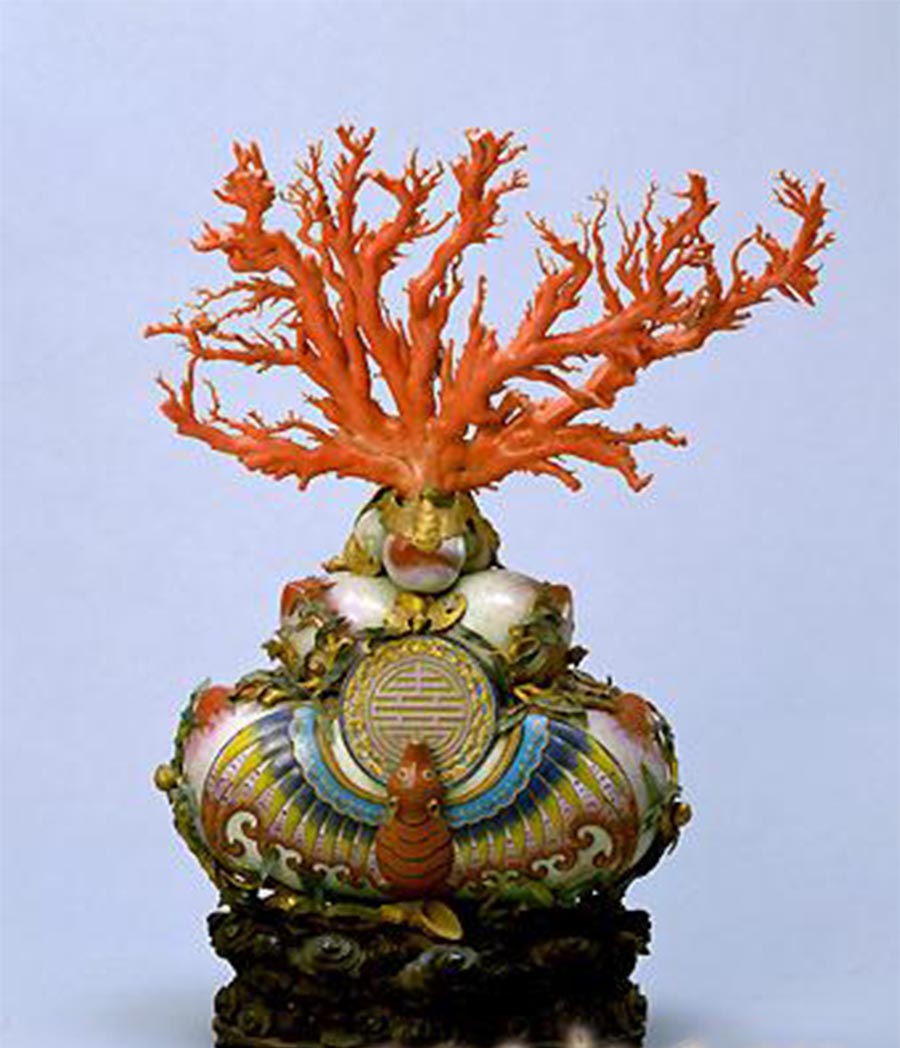 三层垒桃式盆,结合錾金、掐丝珐琅、画珐琅等多种工艺制成。铜杆、掐丝珐琅的枝叶盘曲于底部,并延绕于三层双桃之间,穿插掩映。桃盆前后均有两只大蝙蝠展开双翼,托起一以錾金流云围绕的掐丝珐琅团寿字,三层桃之间还有7只铜镀金小蝙蝠,上下翻飞于硕桃旁。盆中插红色大珊瑚树,鲜艳润泽,形体硕大,枝干分布匀称。此件盆景制作工艺十分复杂,综合了掐丝珐琅、画珐琅、錾花和焊粘等多种技艺,较一般珐琅工艺难度更大。大珊瑚树色泽红艳,粗如腕,阔如扇,颇为壮观,是清宫廷只在帝、后寿典之日才陈设的吉祥景致。