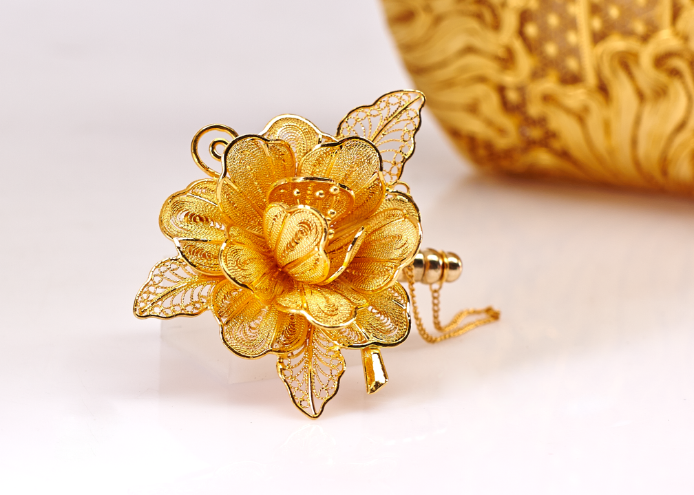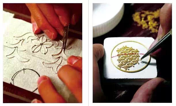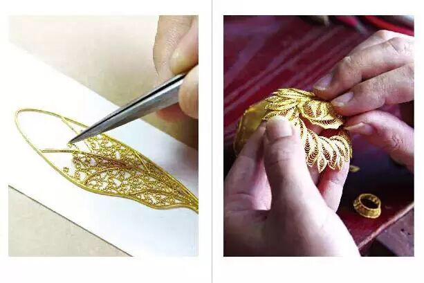 “采金为丝,妙手编结,嵌玉綴翠,是为一绝”,此言所说的花“丝”和镶“嵌”两种制作技艺的结合,即花丝镶嵌技艺,又叫“细金工艺”。花丝选用金、银、铜为原料,采用掐、填、攒、焊、编织、堆垒等传统技法,镶嵌以挫、锼、捶、闷、打、崩、挤 、镶等技法,将金属片做成托和爪子型凹槽,再镶以珍珠、宝石。