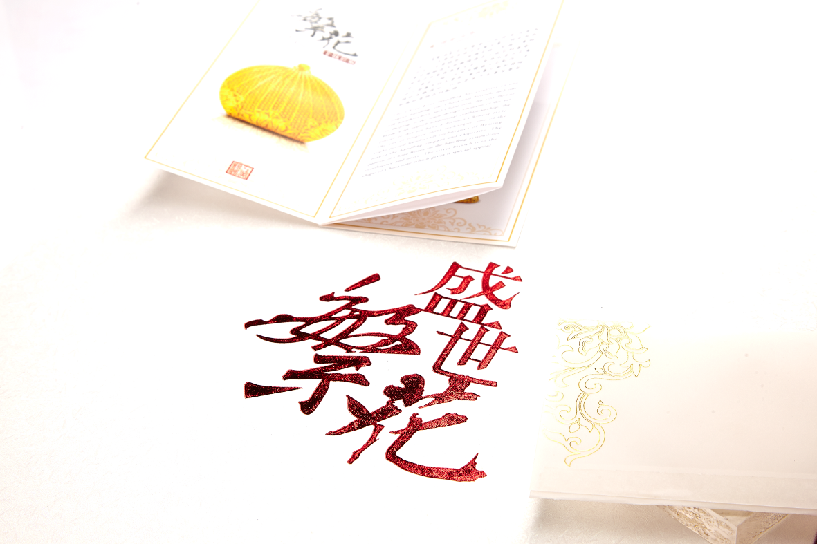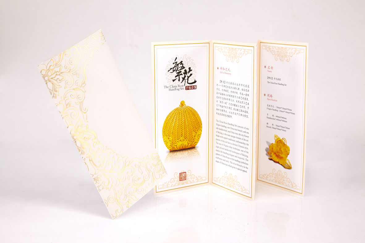 《繁花》的手包造型源于西方潮流式样,似旭日初升;胸针则以北京市代表花卉月季为原型。由郭鸣、袁长君、宋玉、马红芹、申文广五位国家级、北京市工艺美术大师联手创作。整体工艺、色彩和风格,极富皇家气息,传递出2014年APEC会议领导人配偶赠礼的尊贵和高雅,精雕巧琢下成就了APEC国礼的御用神话。