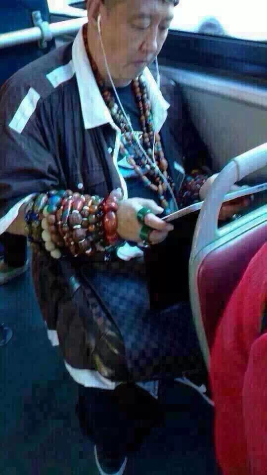 实在不会骑车的,坐公交车的也得够范,翡翠扳指、手串、ipad一个不能少!