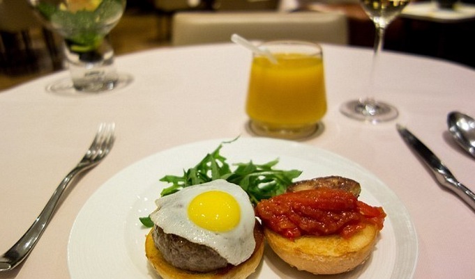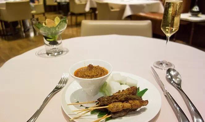 等飞机的时候可以先吃第一顿……小哥要了一杯香槟、鸡肉和羊肉沙爹……焗波士顿龙虾和格鲁耶尔奶酪,埃蒙塔尔奶酪和车达奶酪(前两款为瑞士著名奶酪)。还有顶级牛肉汉堡配鹅肝,芝麻菜配煎鹌鹑蛋。哦,还有芒果冰沙。