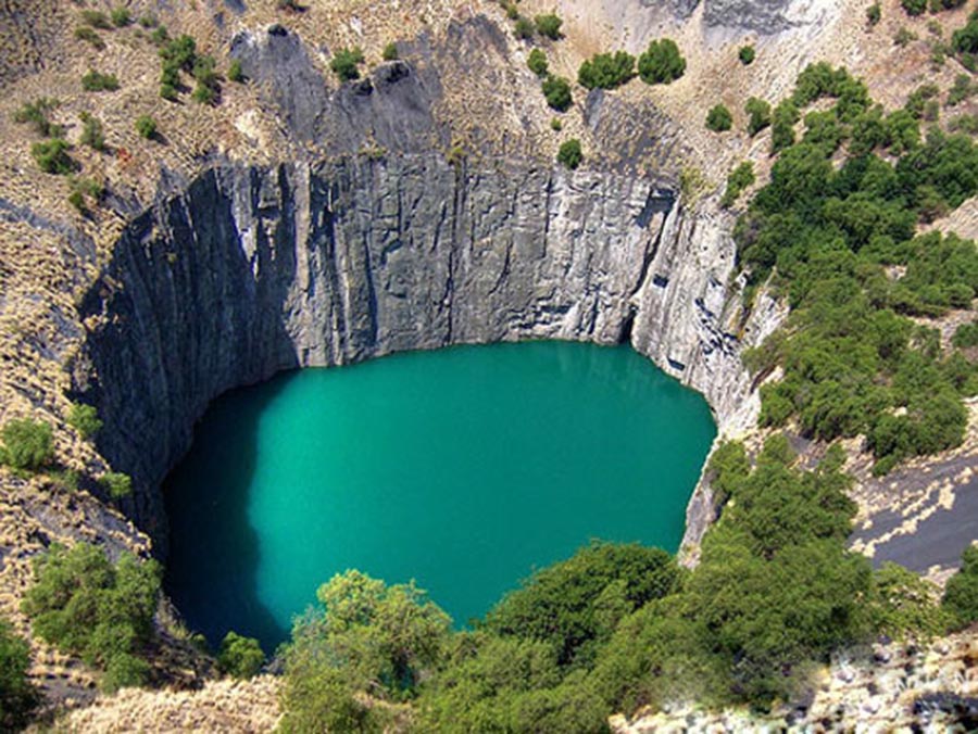 南非金伯利火山岩中的金刚石矿,后来吸引了许多矿业公司到此投资采矿。矿工们沿着火山口向下挖,越挖越深,最后挖成一个大漏斗形状的坑。现在,在南非的金伯利有一个人工湖,湖上边的直径大约0.5千米,越向下就越小,湖底距地面差不多有450米,湖水深250米,从地面向下看,真是如临深渊。其实,这个人工湖就是一个已采完金刚石后废弃的矿坑,湖水是由雨水聚集而成的。在这个矿坑中,曾开采出来大约1500万克拉的金刚石。