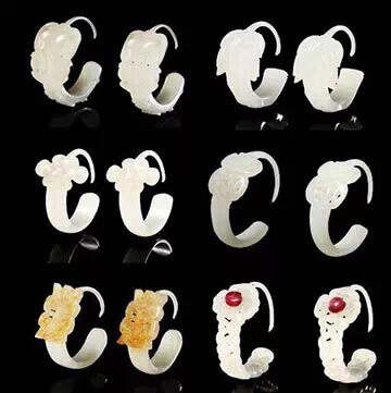 除了用各种复杂金银工艺制作的,还有这种从头到尾全玉雕的耳环。白皙细腻油润的白玉呈弯环状,上面雕着各式吉祥图案。偶尔再镶嵌颗红色宝石,这么鲜艳惹眼戴起来不怕被耳环抢了自己的风头么?