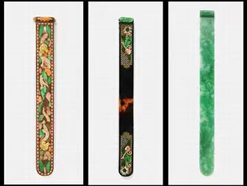 扁方什么材质打造的都有:金银、珊瑚、翡翠、白玉、玳瑁、迦南香…还要在上面用各色宝石镶嵌成吉祥图案←后妃使用的,就是这么讲究。