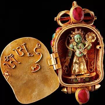 嘎乌盒为小型佛龛,通常制成小盒型,用以佩戴于颈上,龛中供设佛像。密宗行人于出门时佩戴,一者祈求本尊加持,二者于修法时可取出供奉,为随身之密坛。