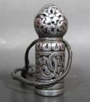 荷包扣在古代多用作袈裟环使用,民间又是烟袋上不可或缺的装饰和实用器。一些老珠子上也挂着这东西,一是用作挂扣,二应该是取其“袈裟环”的内层含义,藏珠上的东西就是藏民生活中喜欢的小东西、小物件,喜欢啥就挂啥,取其意义,渗透出一份虔诚的信仰。