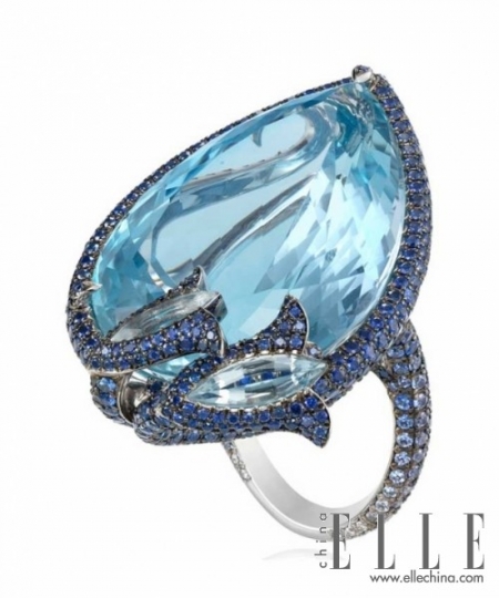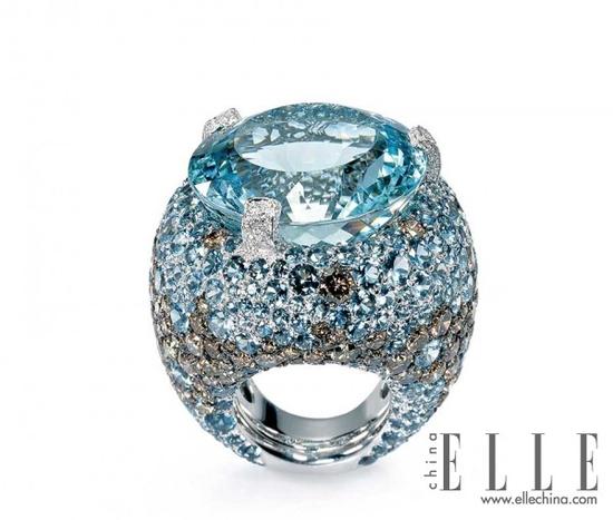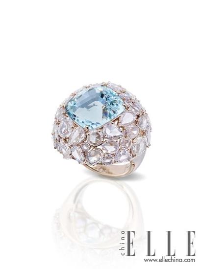 de GRISOGONO海蓝宝戒指这枚戒指铺陈了不仅仅是一颗诱人的海蓝宝石,戒指周边所镶嵌的碎钻里也融入了海蓝宝石的设计,有渐变感。