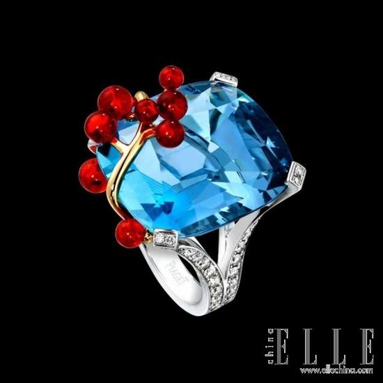 Piaget鸡尾酒戒 Piaget曾推出了一系列养眼又奢华的鸡尾酒戒,灵感正是来自于鸡尾酒。这枚戒指采用了一颗枕形切割的海蓝宝石,左上角镶嵌了火色欧珀石,就犹如一杯诱人的美酒。