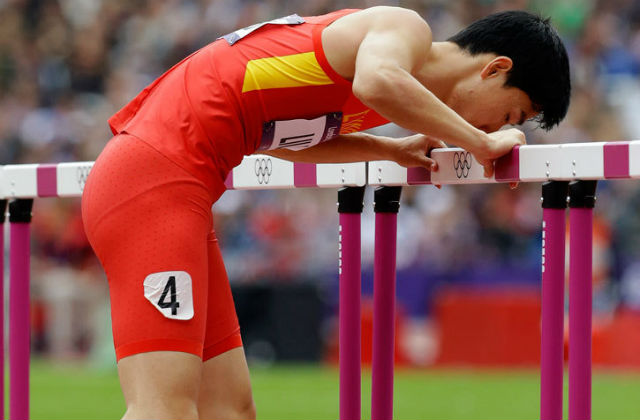 2012年8月7日,奥运会男子110米栏预赛第六组,刘翔在跨第一个栏时意外摔倒,随后强忍剧痛用单腿一步一步跳到栏架前,深情亲吻栏架后,又一步步跳到终点。(资料图)