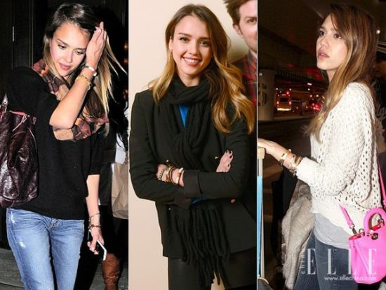 Jessica Alba是波西米亚风的忠实拥护者,无论是通勤装还是可爱俏皮的毛衣打扮,叠带手镯总能很出彩。