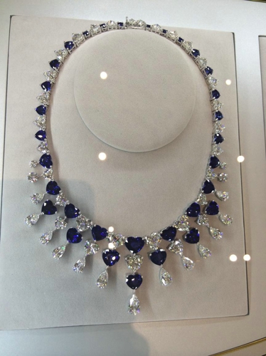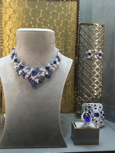Graff 钻石与蓝宝石的项链、手镯及戒指套装。仅戒指上的蓝宝石就重达57克拉,更不用提项链上的钻石和蓝宝石了。