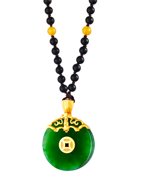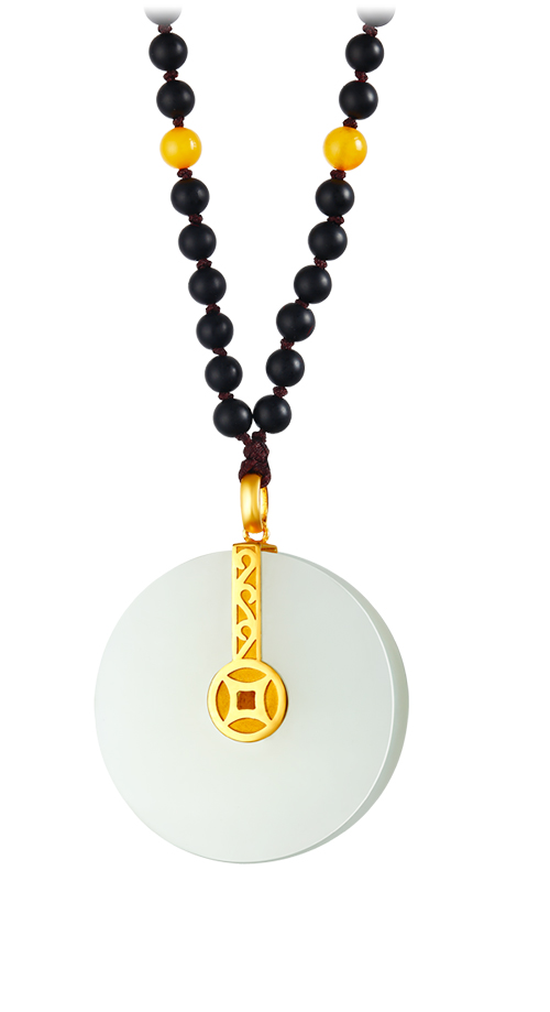 《福在眼前平安扣》则是一件金镶玉作品,以蝙蝠、金钱为元素,“蝠”通“福”,“钱”通“前”,寓意“福在眼前,福佑安康”;玉取昆仑和田玉,有温润定心之效,护佑平安,是福瑞、安宁的象征,包含了人们对美好生活的追求和向往。