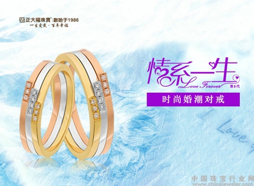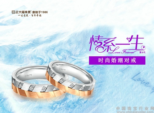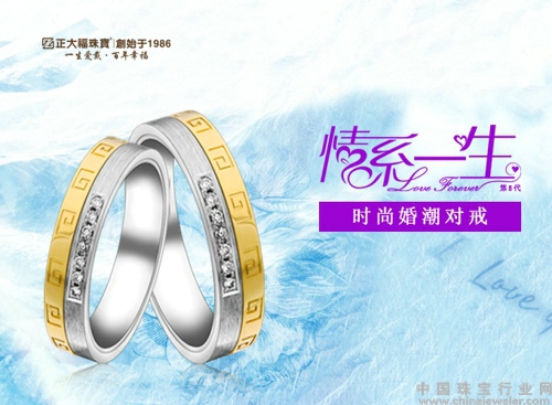2015年,爱你有我,正大福珠宝“情系一生”第五代,全新绽放,以中国传统的回形纹、同心结、几何数字等设计元素,中西兼备,旨在表达相爱的人结好秦晋之好,夫妻白首不相离,携手同进退。整个对戒系列突破传统技艺,匠心独运地采用分色工艺,戒臂一侧可随爱转动,完美衬托钻石的闪耀与高贵,是订婚、结婚的爱侣的佳选。独有的分色工艺,玫色如火,白色如雪,泾渭分明却又天衣无缝。