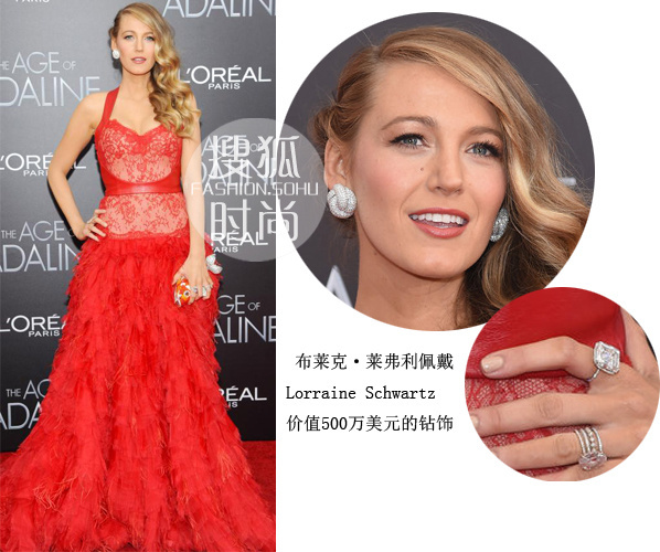 4月19日,电影《时光尽头的恋人》(The Age of Adaline)纽约首映礼,女主角布莱克·莱弗利身穿红色蕾丝羽毛拼接拽地礼服裙,手拿金鱼造型手包,搭配价值500万美元的 Lorraine Schwartz钻饰,明艳动人。