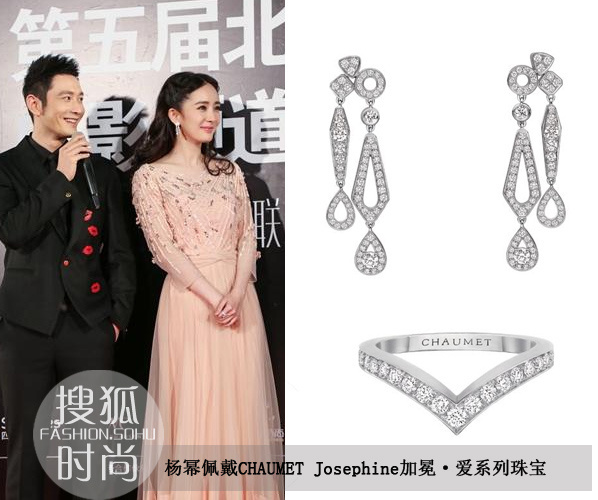 第五届北京国际电影节,当红小花旦杨幂身着浅粉色礼服长裙、佩戴CHAUMET Josephine加冕·爱系列珠宝,于黄晓明一起携其新片《何以笙箫默》登上红毯。