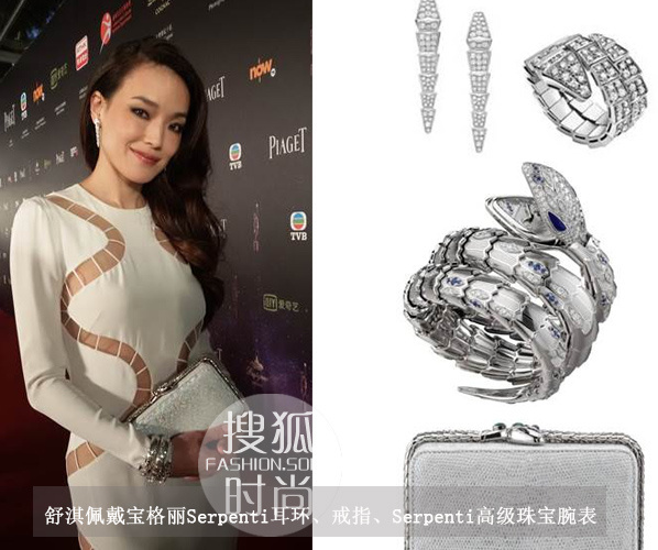 香港金像奖,舒淇以一袭白色礼服搭配宝格丽Serpenti耳环、戒指、Serpenti高级珠宝腕表与同系列晚装包惊艳亮相。Serpenti蜿蜒的曲线与礼服的修身廓形及镂空设计巧妙呼应,完美彰显她的曼妙体态与灵蛇般的迷人魅力。