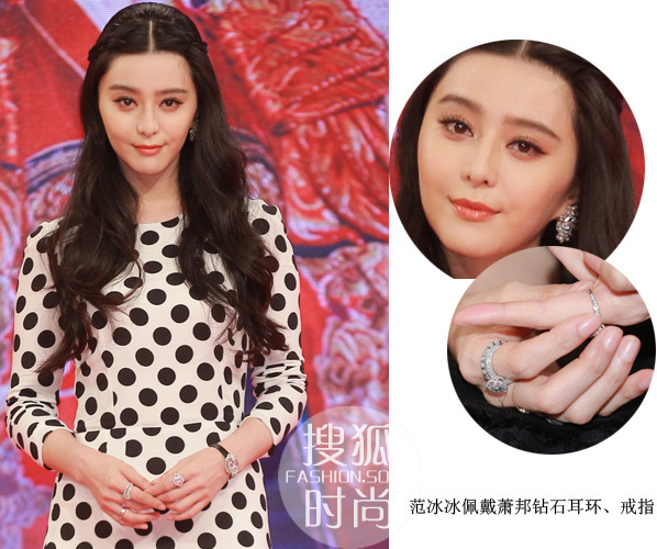 4月20日,范冰冰在香港出席电视剧《武则天》香港版发布会,搭配了价值两千万的40克拉萧邦钻饰,显美艳大气。作为高级钟表珠宝品牌萧邦的代言人,范冰冰偏爱华丽的大号珠宝造型,有强大气场又显巨星身价。