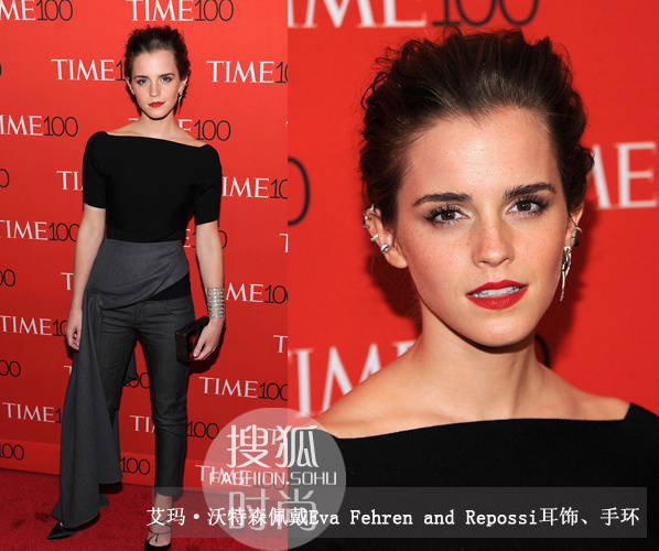 4月21日,艾玛·沃特森(Emma Watson)出席2015《时代》(Time)百位世界影响力人物派对晚宴,佩戴 Eva Fehren and Repossi耳饰与手环亮相。
