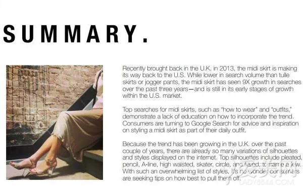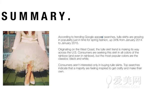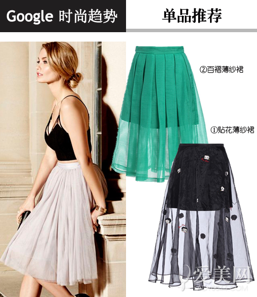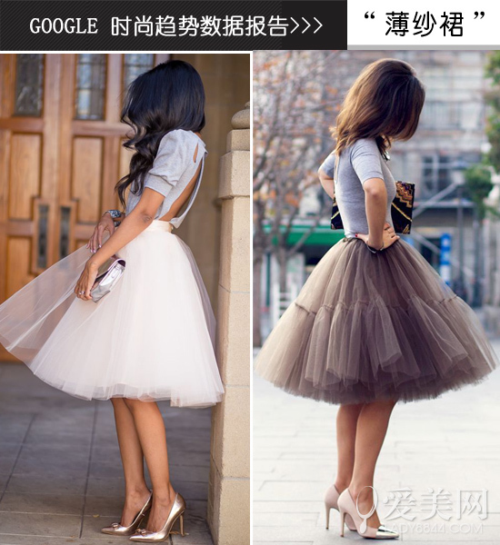 最新消息Google首次发布了时尚趋势报告,利用过去三年中超过六十亿的数据分析,用理性的数字告诉我们现在有哪些单品正在流行,又有哪些单品已经开始走下坡或者根本不再流行!如果你不知道这个面对时尚圈最有力的趋势数据就太说不过去了!Google根据薄纱裙的大数据分析,得知薄纱裙的热度从从2014年1月至2015年1月上升了整整34%!而购买者更倾向于黑白颜色。
