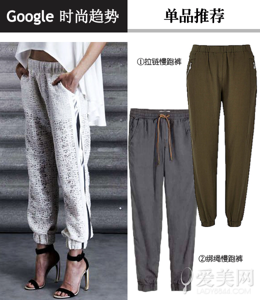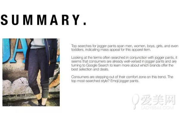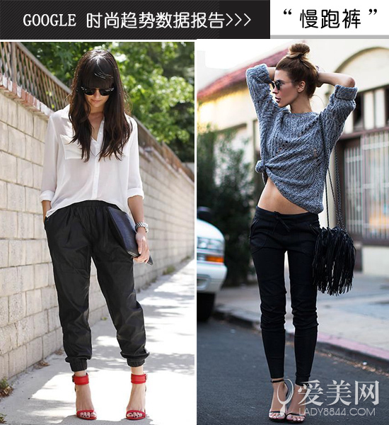 白色牛仔裤、喇叭牛仔裤和机车牛仔裤越来越流行,而搜索普通紧身牛仔裤的人骤降。但人们对束脚慢跑裤的热情急剧升温,从皮质材料到表情图案,在Google的搜索排名都一直靠前!