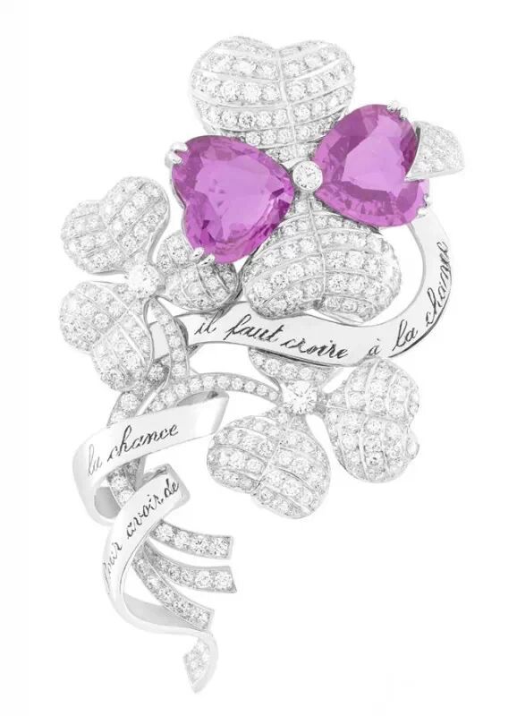 1896年出身宝石世家的艾斯特尔.雅宝(Estelle Arpels)邂逅了切石匠之子阿尔弗莱德.梵克(Alfred Van Cleef)。两人的爱情故事由此拉开了序幕,并携手走过了超乎想象的浪漫旅程。婚后他们在花园中种上大片的苜蓿草,渐渐地他们发现这种植物虽然平凡,但有自己的神奇之处,那就是在十万株苜蓿草中可能只会发现一株是“四叶草”。 1906年,他们顺利接管家族珠宝生意,并用自己的浪漫经历创造出一个品牌,那就Van Cleef &Arpels ,而他们则以象征幸运的“四叶草”为灵感,独创了令世人惊羡的隐秘式镶嵌法工艺,能够像安置两颗热恋的心一样巧妙地将各种珍贵宝石紧密结合在一起。