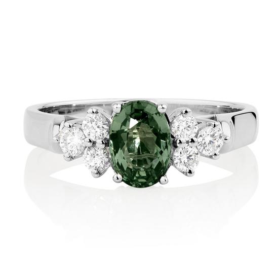 绿色蓝宝石拥有一系列丰富的绿色调,无论是热带的石膏色还是酒瓶的绿色,都散发着独具特色的光芒与魅力。在所有彩色蓝宝石中,绿色蓝宝石的光泽最好,颗粒质量很少有超过几克拉的。在颜色上与绿色电气石、绿色锆石很相似。上等的绿色蓝宝石产在坦桑尼亚,已有的绿色合成刚玉其颜色较天然的鲜明。