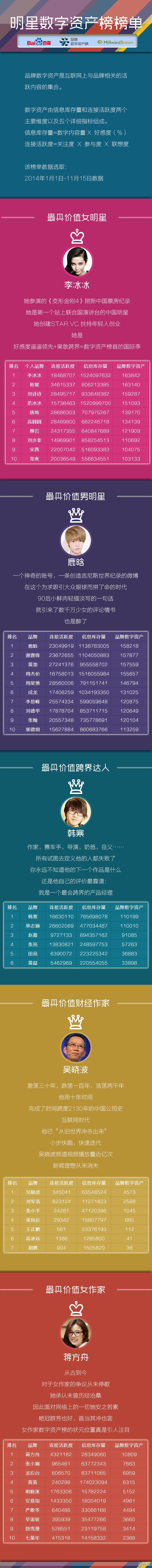 2014年度,李冰冰以排名第一的成绩成为品牌数字资产榜女“土豪”,其中她的网民好感度指标更是遥遥领先其他99.9%的明星。