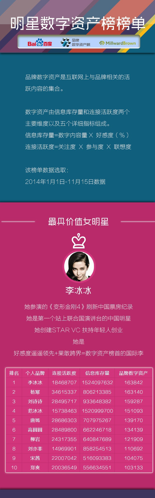 据悉,百度数字资产“最具价值奖”的判定主要是在过去一年中百度各项信息搜索中与明星相关的活跃内容集合。主要由信息库存量和连接活跃度两个主要维度及五个详细指标组成。其中信息存量包括数字内容量和好感度,通俗点说就是这一年里明星有多少新闻,以及网民对这些新闻的认知口碑。而连接活跃度则主要是明星的关注度、网民参与度和联想度。
