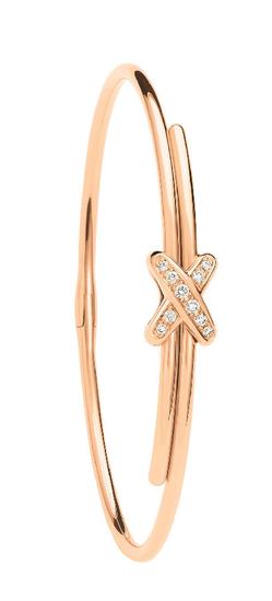 尚美巴黎Liens 缘系•一生系列 玫瑰金镶钻手镯 参考价格:40,700 CNY推荐理由:将经典元素诠释出不同的款式,即便是简约的设计风格,也可以满足现代女性对于珠宝的追求。Liens在法语中被译为“联系,连接”的意思,这也是“X”型交叉扣设计的灵感来源,同时也代表了中国文化中的“缘分”一词,“X”象征着爱侣热切拥抱的符号。Liens系列简洁而低调的设计轻巧且时尚,两条平行的纽带环绕并交叉重迭,在肌肤上造出一个珍贵的交错图案。不仅适用于日常着装,同时也满足搭配晚礼服的需求。