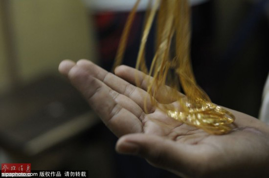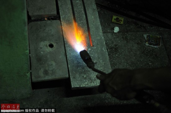 不过很多小规模的黄金首饰加工厂目前仍然处于效率低下无组织的状态,所使用的技术仍依靠人工,工人们只能夜以继日地工作。图为一名工人正在用火软化黄金,以便将其拉伸为所需的尺寸。