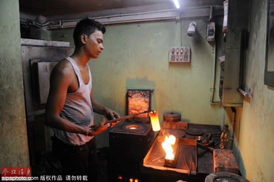 他们并不是按固定的时间计划来工作,而是按委托和订单,健康和卫生问题常常被忽略。但由于工匠的天赋和勤奋,产品总能满足市场的需求。图为在火焰上加工的黄金。
