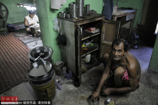 业主多数情况下会为他们提供免费的食物和住宿,但很多都被塞到一个或两个拥挤不堪的房间内。图为这个加工厂的厨师Gobindo(右),他正在为工人们做饭。