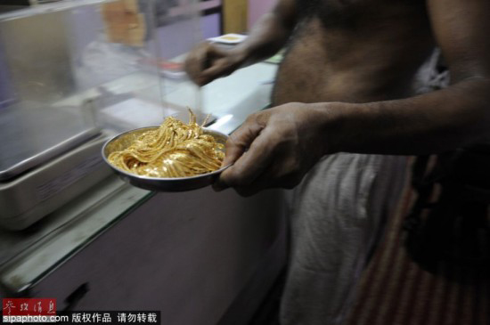 作为印度国内经济增长最快的行业之一,珠宝业在2013年拥有404.5亿美元的市场,并且还会在接下来的5年内增长一倍。图为一名工人将融化的黄金倒入模具内放在火上加工。