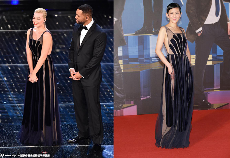 玛戈-罗比与吴君如撞衫valentino 2015春夏透视薄纱礼服。玛戈-罗比明显要比吴君如看起来肉感,但是两人都没有能够演绎出valentino仙气飘飘的感觉。
