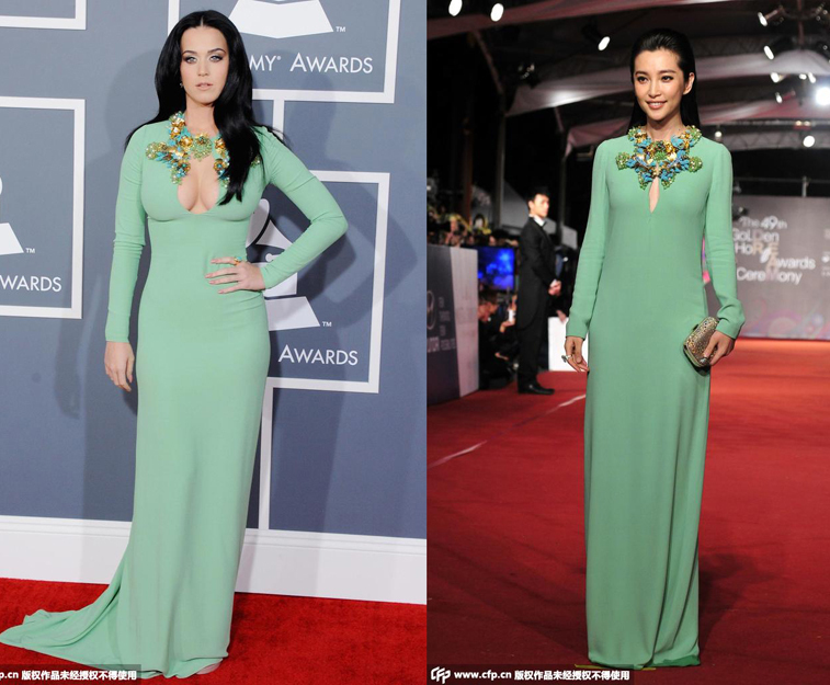 凯蒂-佩里与李冰冰:gucci 冰淇淋绿花瓣领礼裙。最大差别在胸上。