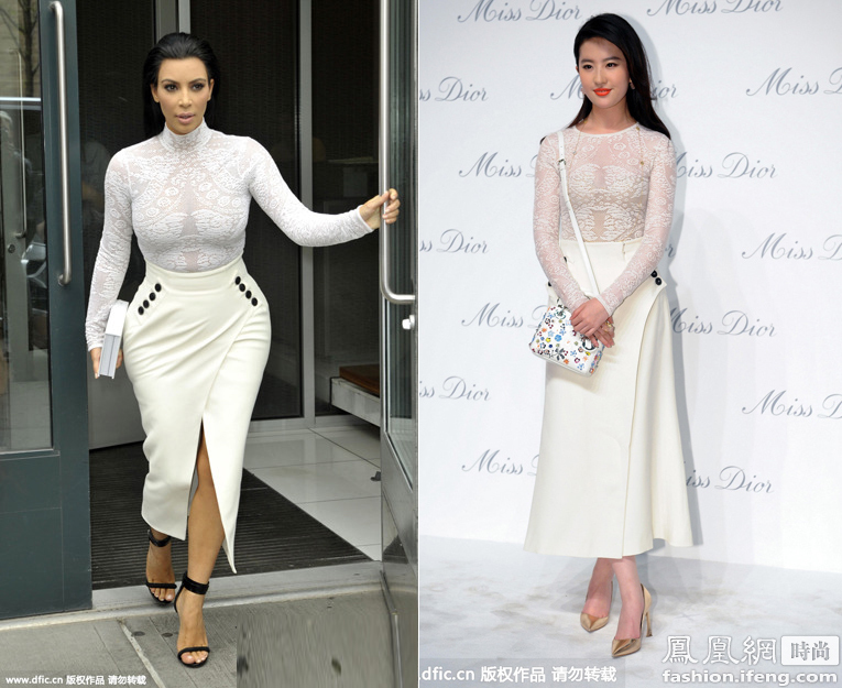 由于身材结构不同,欧美人与亚洲人在穿同一件衣服的时候能演绎出完全不一样的风格,今天来看一组欧美人与中国人同穿一件衣的区别,图为金-卡戴珊与刘亦菲同穿christian dior 2015春夏白色蕾丝透视上衣配开叉包裙亮相。这套全白look穿在刘亦菲身上,虽然不至于仙气十足,但至少没有变味,卡戴珊穿上则变成了"女金刚",把法式优雅硬是穿出了爆乳俗气!