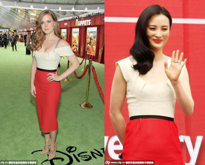 艾米-亚当斯与蒋勤勤:roland mouret 红白拼色高腰铅笔裙。艾米-亚当斯直接将衣领拉成了一字肩,更符合自己的风格,蒋勤勤则显得优雅端庄。