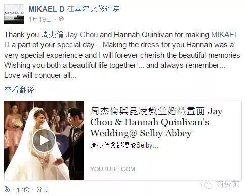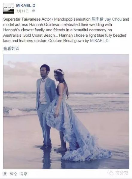 这场婚礼的婚纱来自mikael d,一个黎巴嫩设计师的品牌,嗯,黎巴嫩是个盛产仙女裙设计师的地方,eliesaab的设计师也来自黎巴嫩。品牌还在脸书上为周董和昆凌发去了祝福。