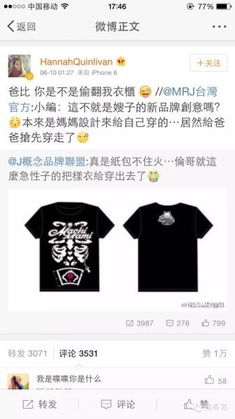 快要做爸爸的周董还是很顽皮的,他身上这件t恤是昆凌设计给自己穿的,结果被周杰伦先偷跑穿了哈哈。
