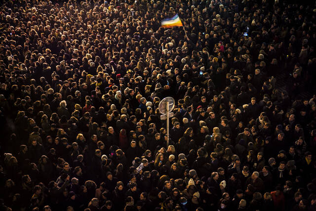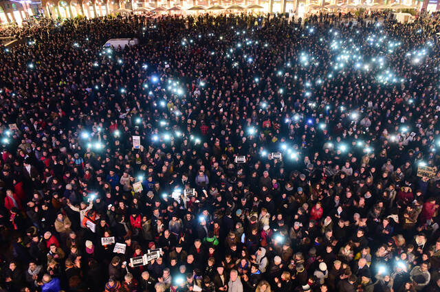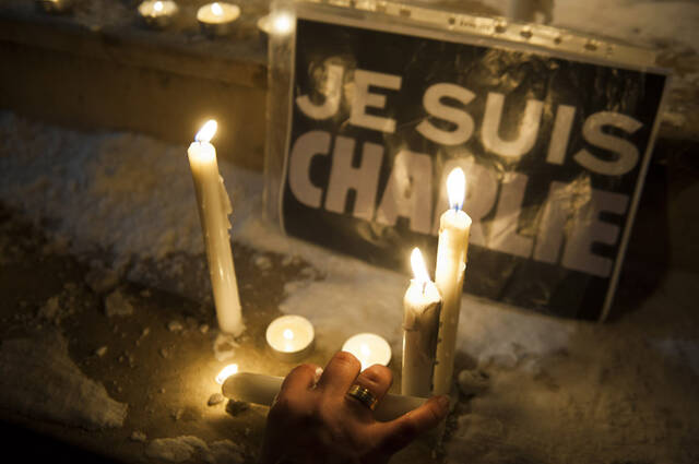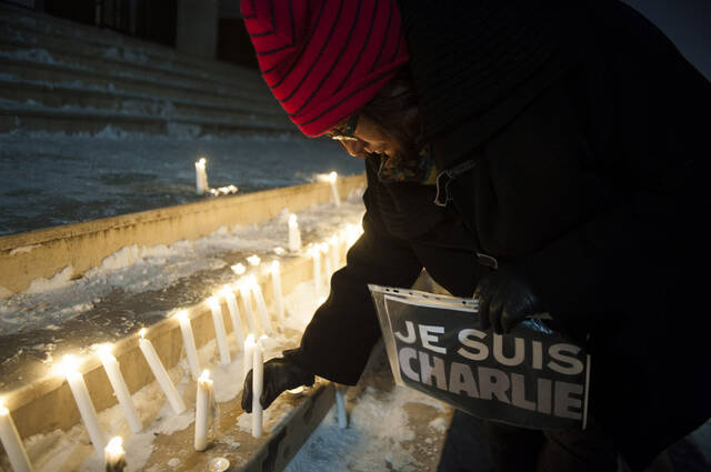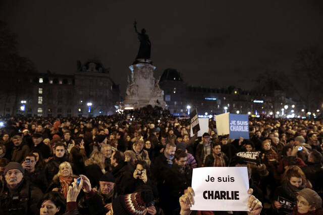 2/11在巴黎《查理周刊》办公室遭袭击,共造成12人死亡后,法国人聚集在巴黎共和广场,手持蜡烛,高举标语,对袭击事件予以谴责和抗议,对遇难者表示哀悼。